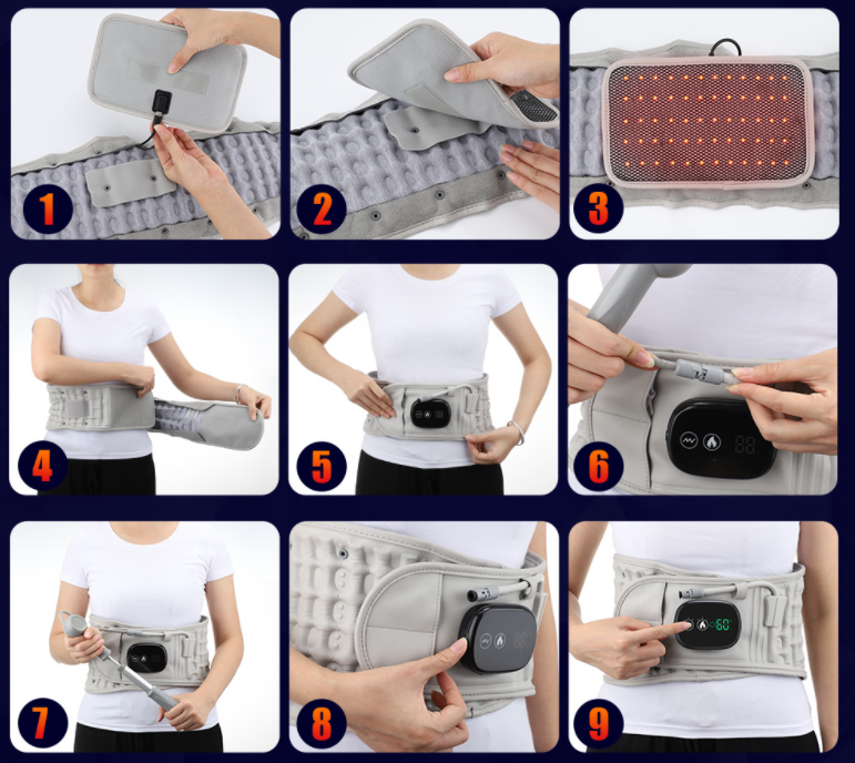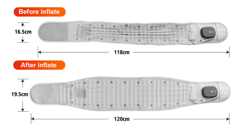 1*Inflatable belt 1*Red light heating pack 1*Extension pad 1*Inflatable hand pump 1*Charging cable 1*Instruction manual 1*Color box
